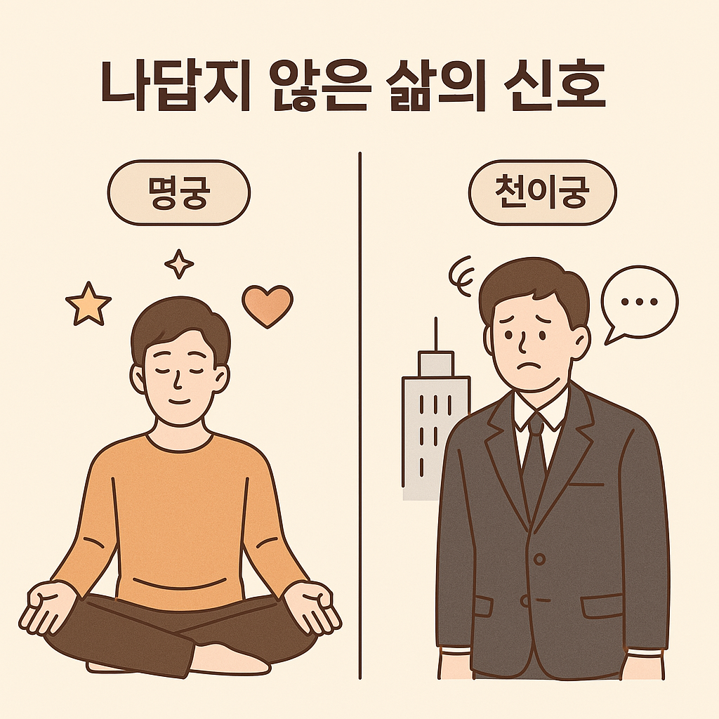 1. 쉬어도 회복되지 않는 이유는 ‘내면 에너지 충돌’ 때문이다많은 사람들이 ‘피곤하다’는 말을 입에 달고 삽니다.하지만 진짜 문제는 바빠서가 아니라, 에너지가 ‘어긋나 있기 때문’입니다.자미두수에서는 ‘명궁’과 ‘복덕궁’의 상호작용을 통해,이런 무형의 피로가 어디서 오는지를 읽어낼 수 있습니다. 2. 명궁과 복덕궁은 각각 무엇을 의미하나?구분의미작용명궁(命宮)삶의 방식, 주체성, 행동성향내가 세상을 대하는 방식복덕궁(福德宮)감정의 저장소, 회복 방식내가 감정적으로 쉬는 방식명궁은 외부로 발산되는 리듬,복덕궁은 내부에서 감정을 정리하고 회복하는 리듬입니다. 3. 충돌하는 명궁-복덕궁 조합은 이런 피로감을 만든다자미두수에서는 명궁과 복덕궁의 좌성(주성)이 서로 조화를 이루지 못할 때,다음과 같은 현상이..